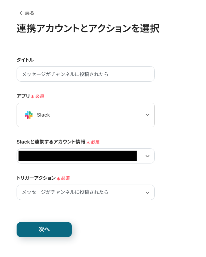 トリガーアクション:プルダウンより設定可能です。今回はデフォルトで設定されている項目(メッセージがチャンネルに投稿されたら)のまま進みましょう。