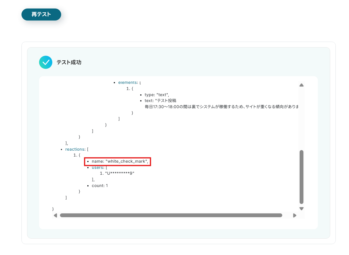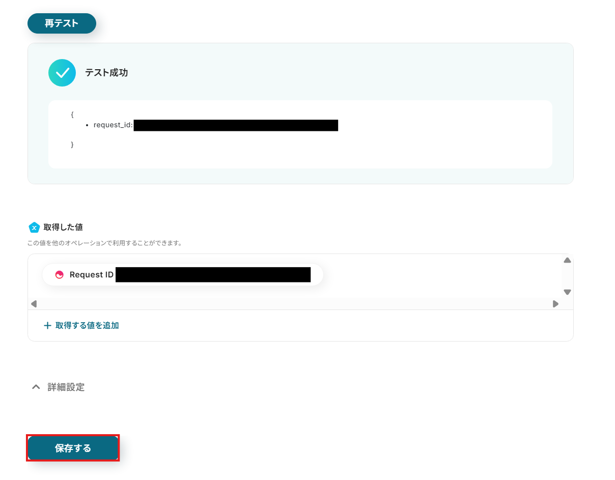 テスト成功が表示されていれば設定完了となります。画面下の保存するボタンを押下し、Memのアクション設定を完了させてください。