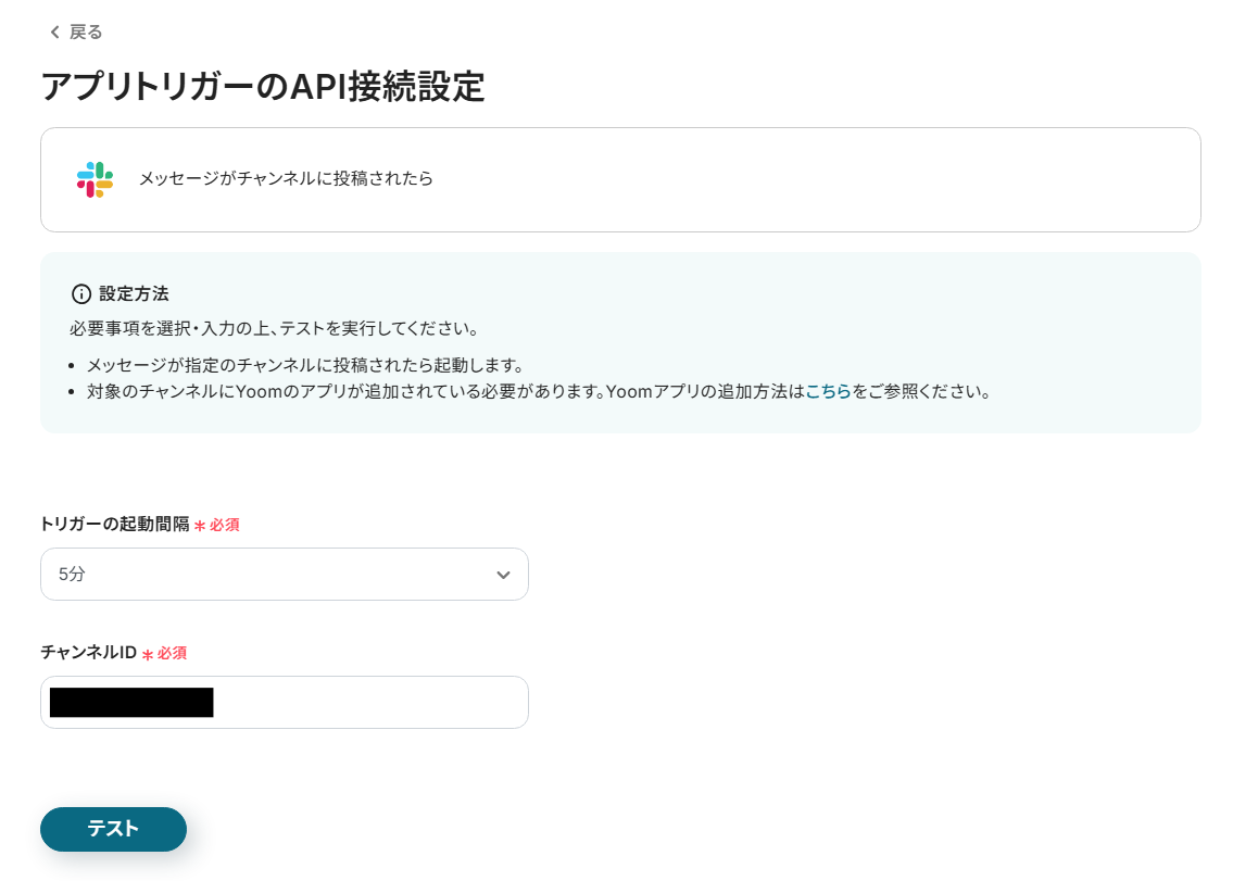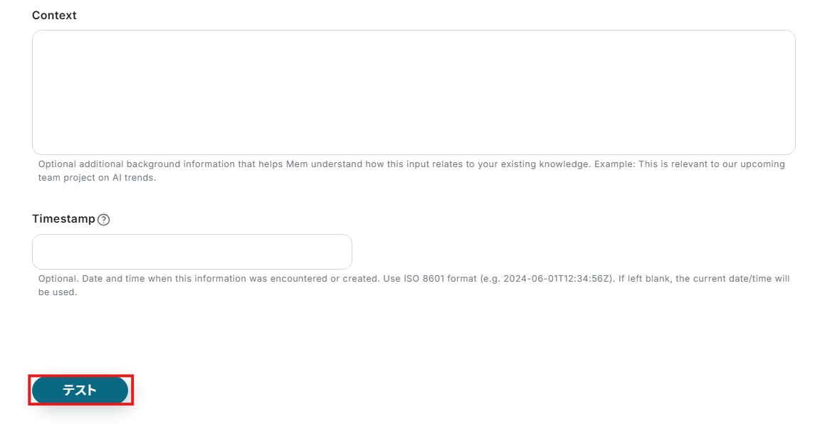 その他の項目はYoom画面の注意書きを参考に任意で入力を行ってください。 設定が完了したらテストボタンをクリックしましょう。(※実際にMemに書き込みが行われます )