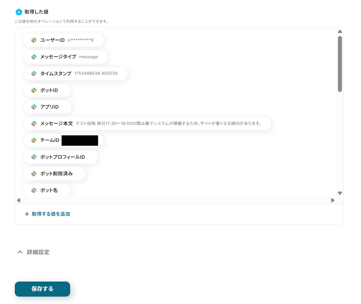 画面下の保存するボタンをし、Slackのトリガー設定を完了させてください。 ※「取得した値ってなんだろう?」と思った方は下記の記事をご参照ください。