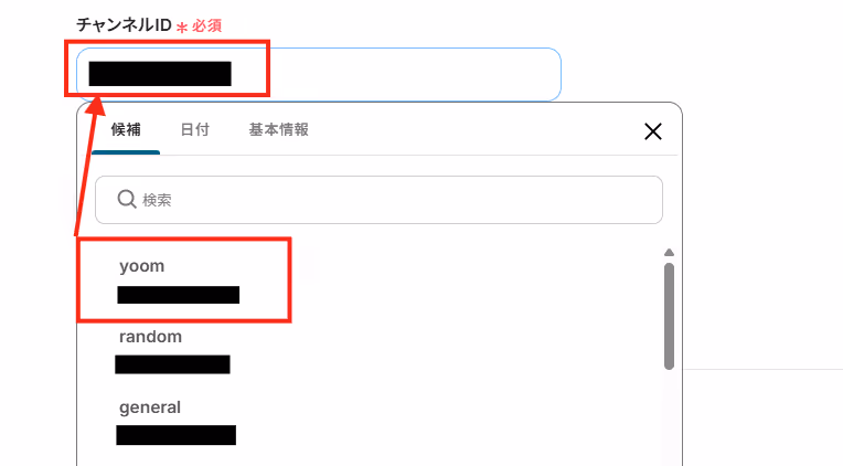4.「チャンネルID」は、入力欄をクリックして表示される候補から選択してください。