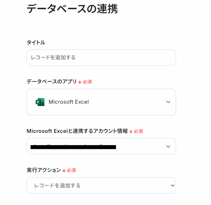 2.「Microsoft Excelと連携するアカウント情報」を確認し、「実行アクション」はそのままで、「データベースの連携」を設定していきます。