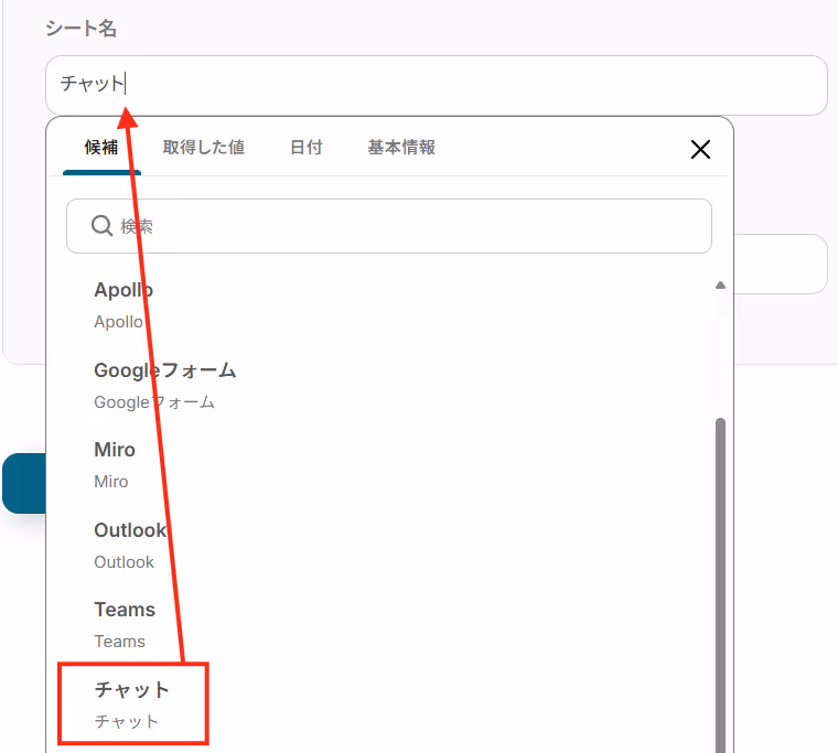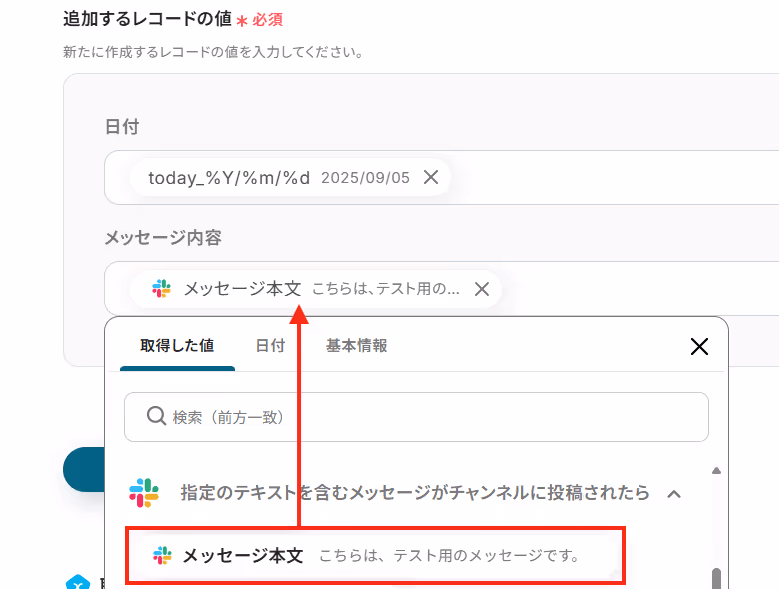 「追加するレコードの値」の各項目は、入力欄をクリックして表示される取得した値から選択してください。