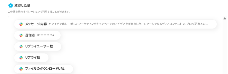 ・メッセージ:任意のメッセージを入力します。以下のように①で取得した値を埋め込むことも可能です。(アウトプットを埋め込む)