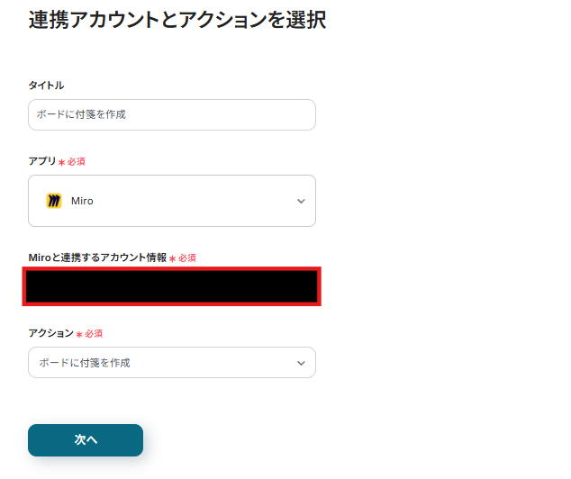 連携アカウントとアクションを選択する画面が表示されるので、今回連携するMiroのアカウントを確認し「次へ」をクリックします。