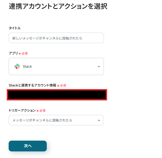 連携アカウントとアクションを選択する画面が表示されるので、今回連携するSlackのアカウントを確認し「次へ」をクリックします。
