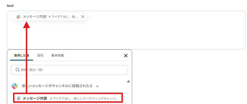 textには以下のようにSlackから取得した値のメッセージを入力しましょう。
