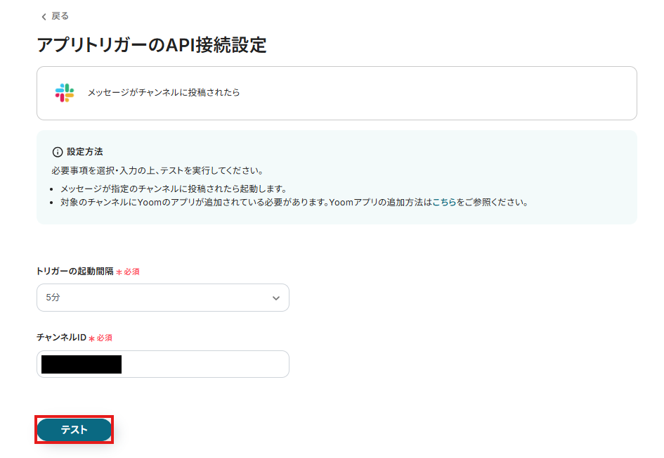 「アプリトリガーのAPI接続設定」画面ではSlackのどのチャンネルに来たメッセージを、どのくらいの時間間隔で取得するかを設定します。以下のように設定を進めましょう。