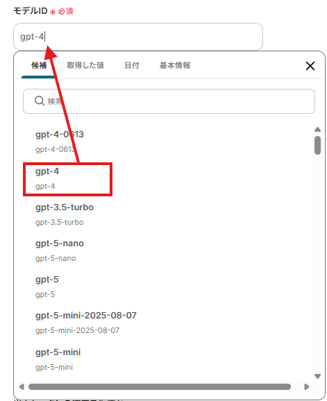 - OpenAIでテキストを生成するアクションでは、利用したいモデルIDを任意で設定してください