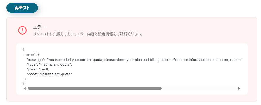 - ChatGPTのAPI利用はOpenAI社が有料で提供しており、API疎通時のトークンにより従量課金される仕組みとなっています。そのため、API使用時にお支払いが行える状況でない場合エラーが発生しますのでご注意ください。