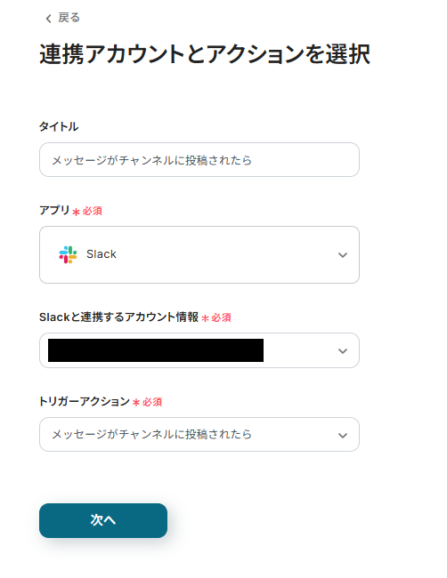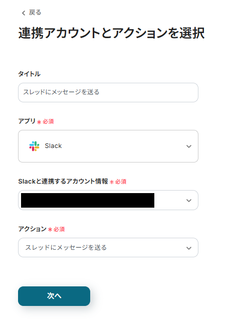 「連携アカウントとアクションを選択」画面では以下を設定していきます。