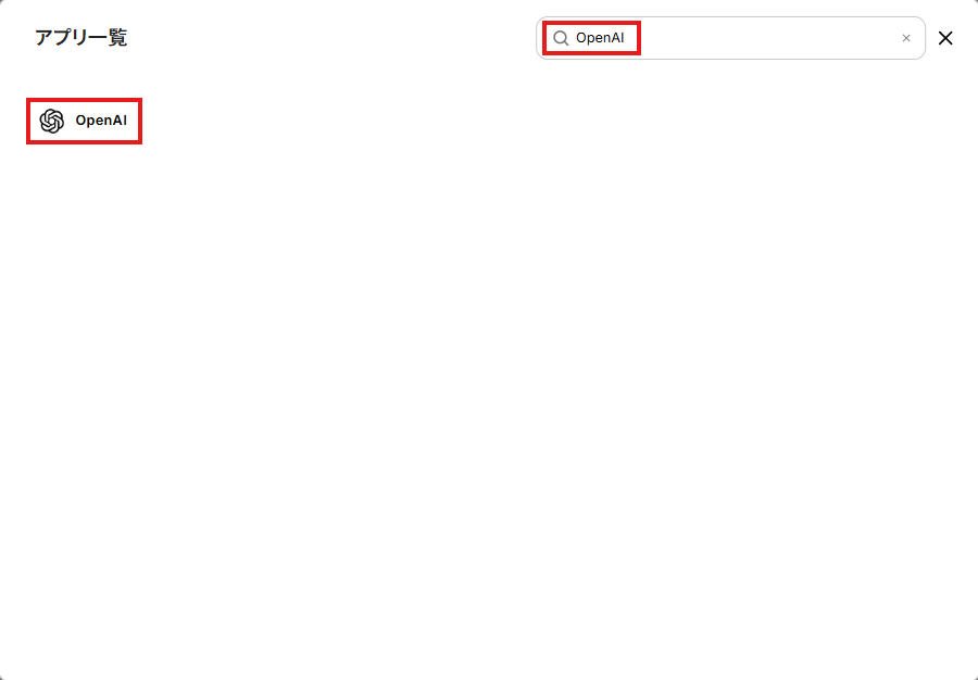OpenAIのマイアプリ連携を行っていきます。検索ボックスにOpenAIと入力し、OpenAIのアイコンをクリックします。