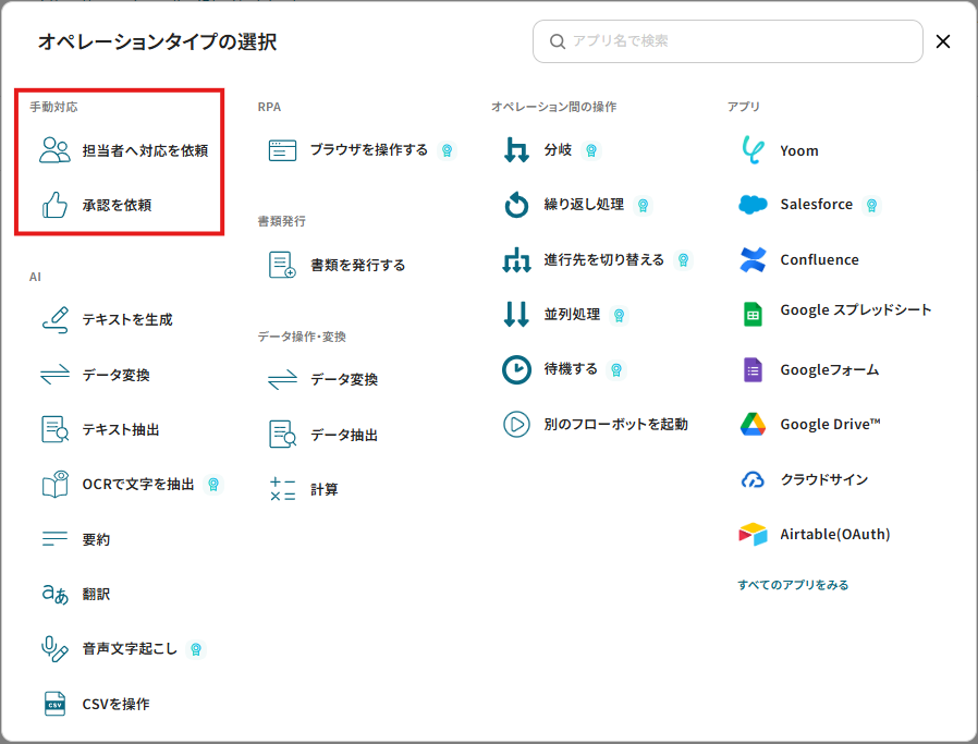 A:はい。オペレーションタイプの選択から「担当者へ対応を依頼」や「担当者へ対応を依頼」をフローに追加することで、人間が確認するステップの追加が可能です。