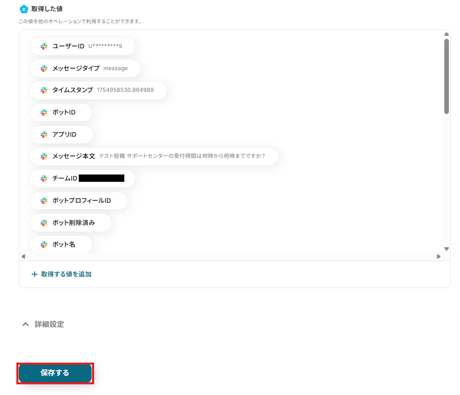 - 最後に、オペレーションでSlackの「スレッドにメッセージを送る」アクションを設定し、生成した回答を元の投稿のスレッドに返信します