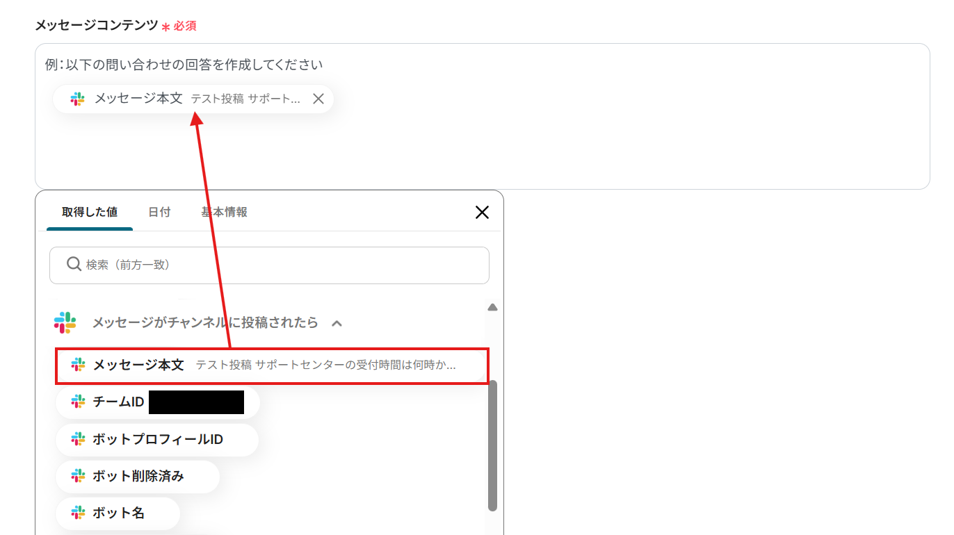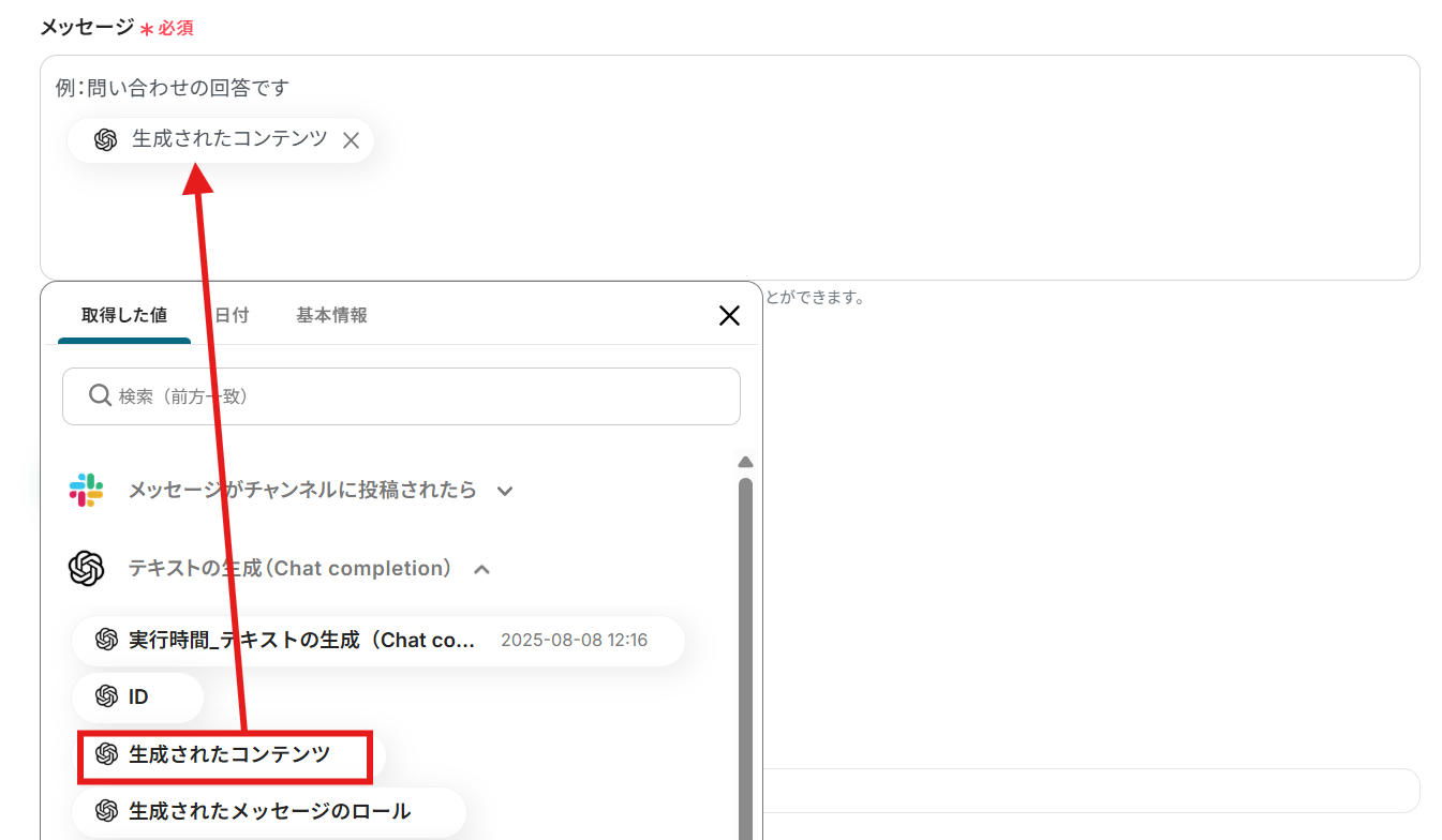 - 続けて、オペレーションでOpenAIを選択し、「テキストの生成」アクションを設定します。トリガーで取得したメッセージ内容を基に、回答を生成するようプロンプトを構成します。