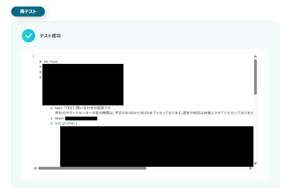 - 最後に、オペレーションでSlackの「チャンネルにメッセージを送る」アクションを設定し、OpenAIが生成した回答を指定のチャンネルに投稿します。