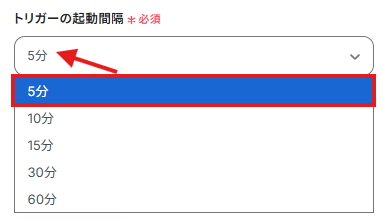 - トリガーの起動間隔は、5分、10分、15分、30分、60分のいずれかで設定できます。