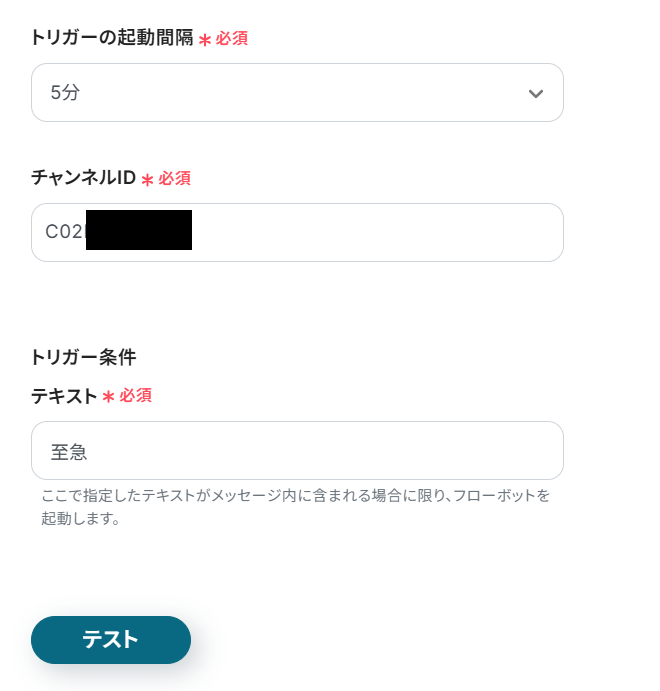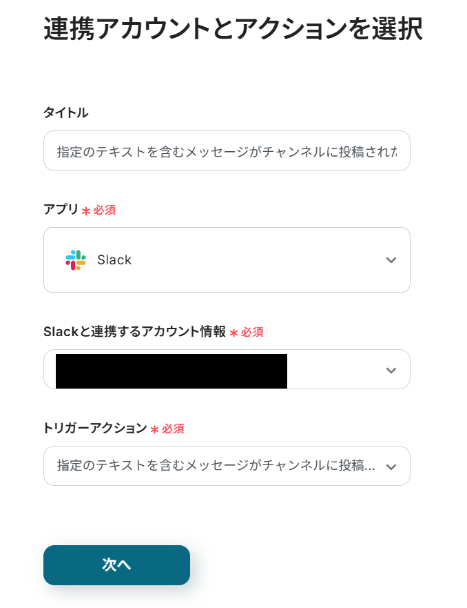 - トリガーアクション:Slackで指定のテキストを含むメッセージがチャンネルに受信したら起動します。