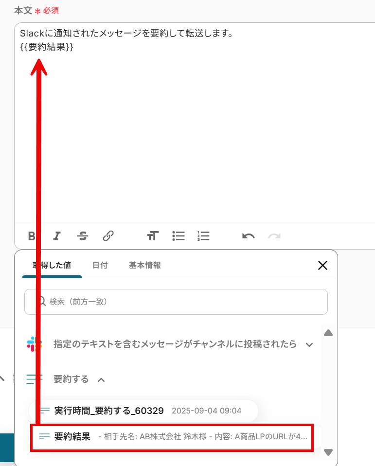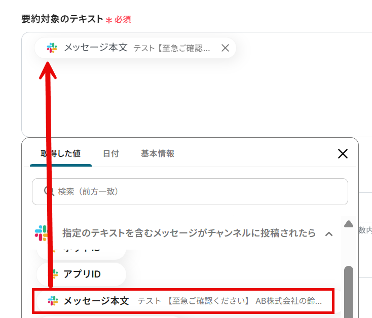 要約対象のテキストは、前項で取得した値を使用して設定します。