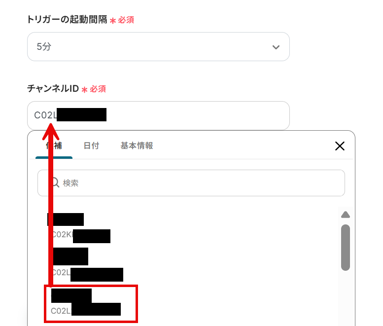 チャンネルIDのフィールドをクリックし、候補の中から連携したいチャンネルを選択します。