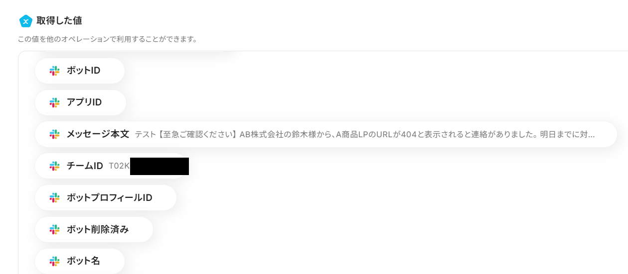 取得した値を使用することで、テキストが固定化されず、フローボットが起動する度に新しい値が反映されます。