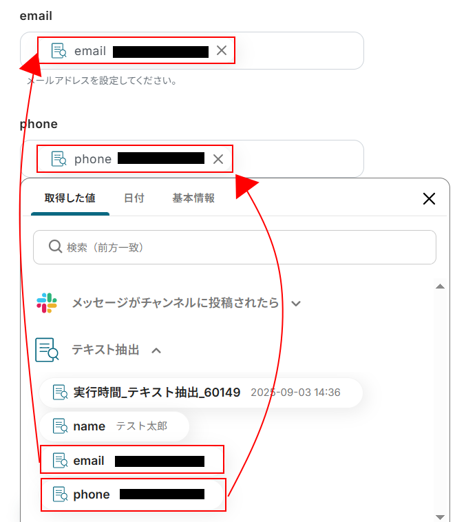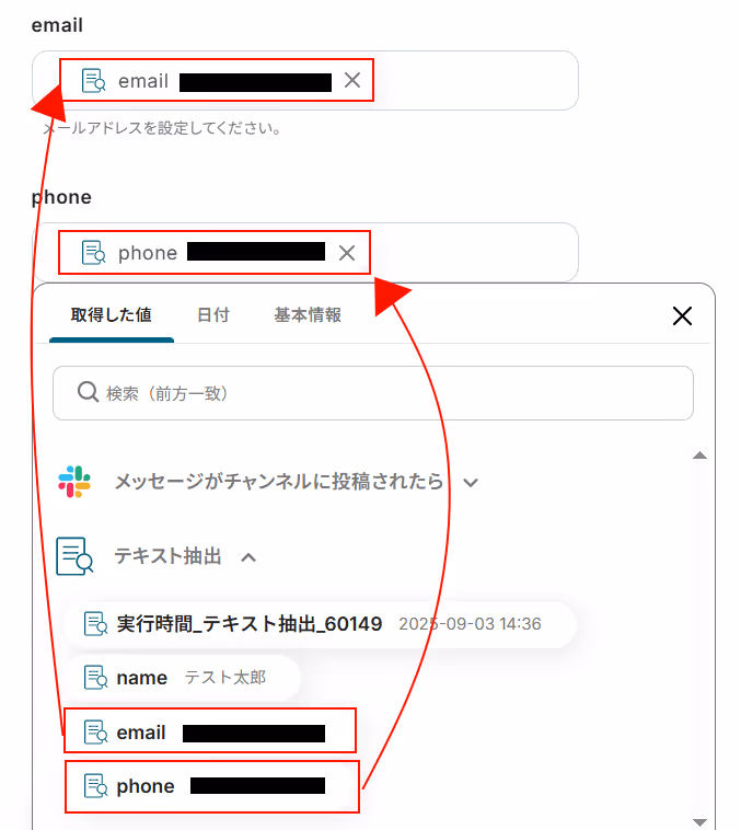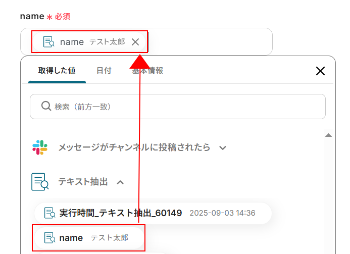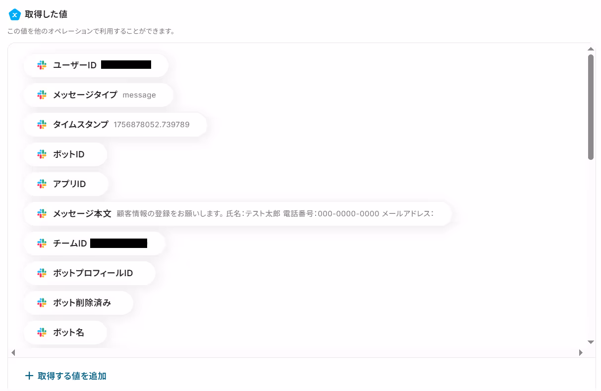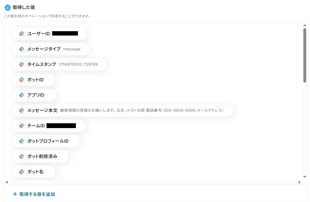 取得した値とは、トリガーやオペレーション設定時に、「テスト」を実行して取得した値のことを指します。