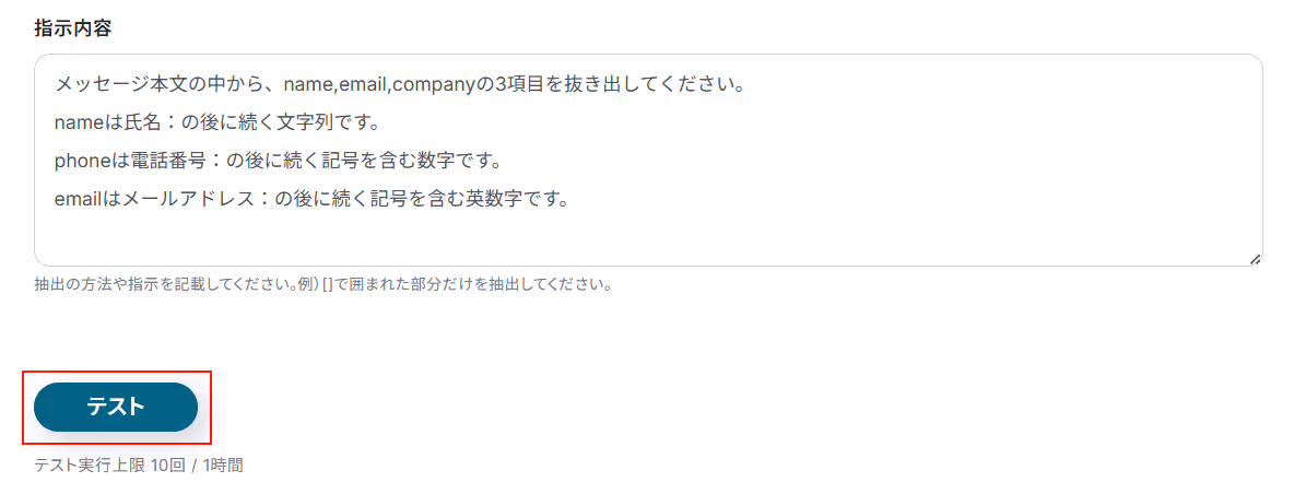 指示内容を入力せずに設定することも可能ですが、予期しない文言が抽出されるのを避けるためにも、なるべく具体的に入力してください。