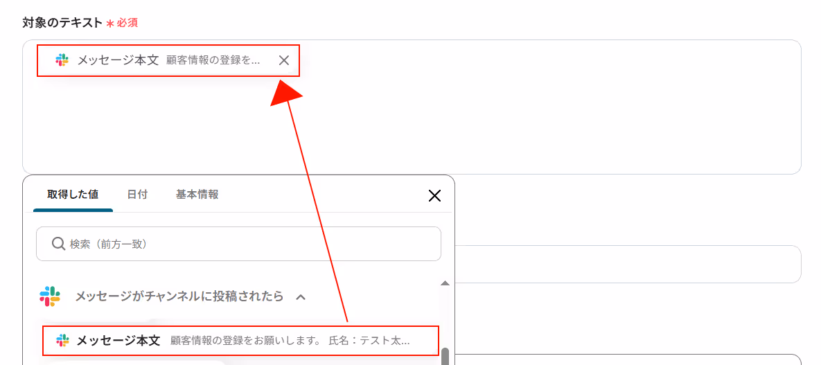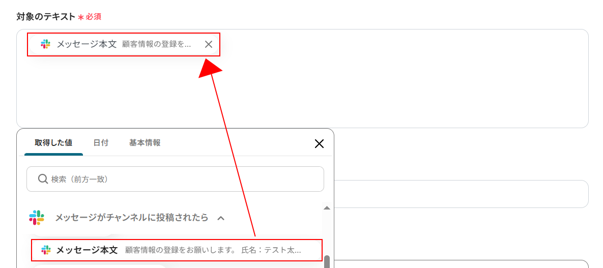 デフォルトで取得した値であるメッセージ本文が選択されているため、今回はそのまま使用します。