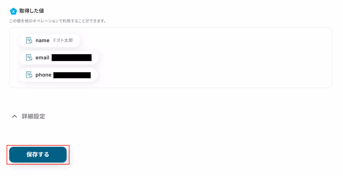 想定通りの値が取得できているのを確認したら「保存する」をクリックしましょう。