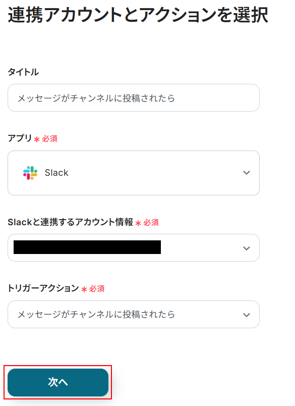 特定のキーワードを含む投稿のみを連携したい場合は、トリガーアクションを、「指定のテキストを含むメッセージがチャンネルに投稿されたら」もしくは「指定のテキストを含むメッセージがチャンネルに投稿されたら(正規表現で指定)」に変更してください。Slackのトリガーについて詳しく知りたい方はこちらをご覧ください。