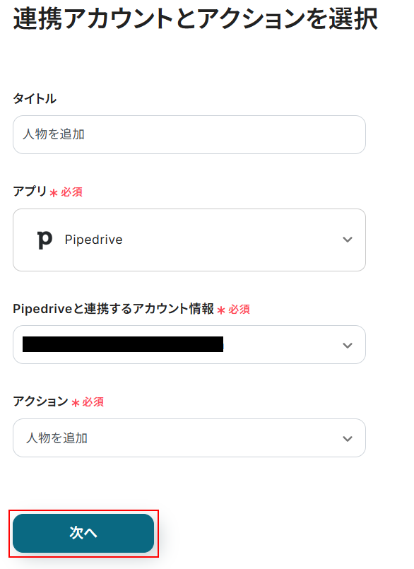 Pipedriveと連携するアカウント情報には、ステップ1で連携したアカウントか連携実行時のYoomのアカウントが表示されています。