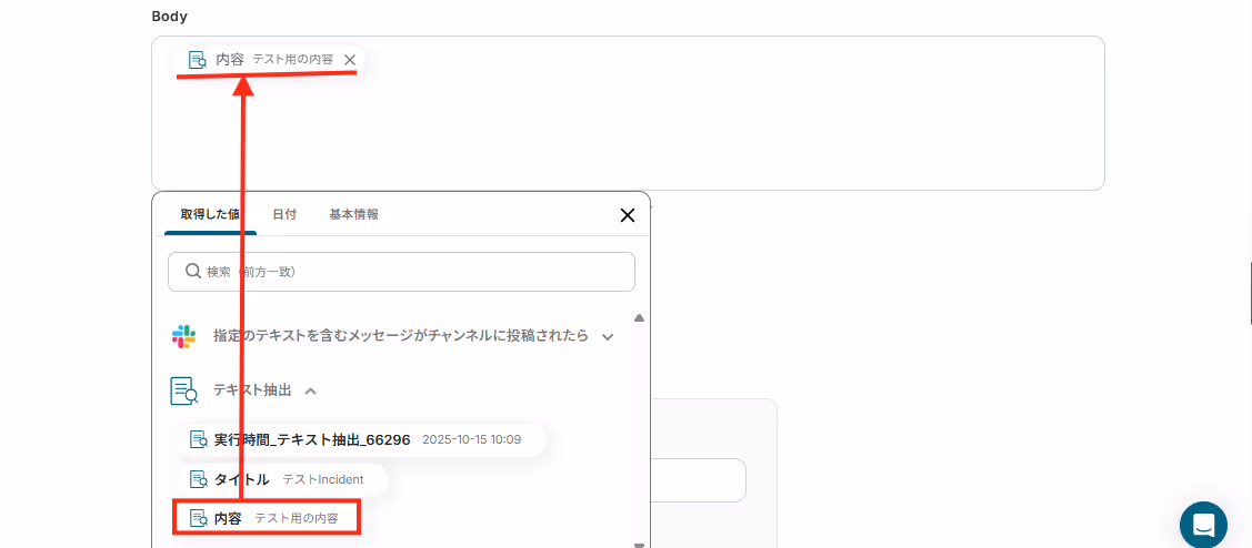この設定により、Slackに送信されたメッセージ本文を自動で取得し、抽出対象のテキストとして指定することが可能です。