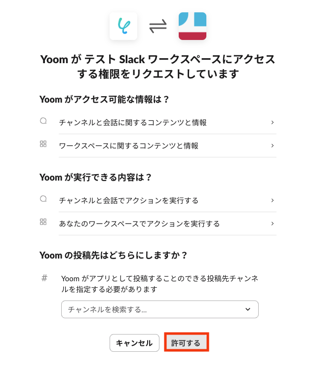 連携先のSlackワークスペースが表示されたら、投稿先のチャンネルを選択し、「許可する」をクリックします。