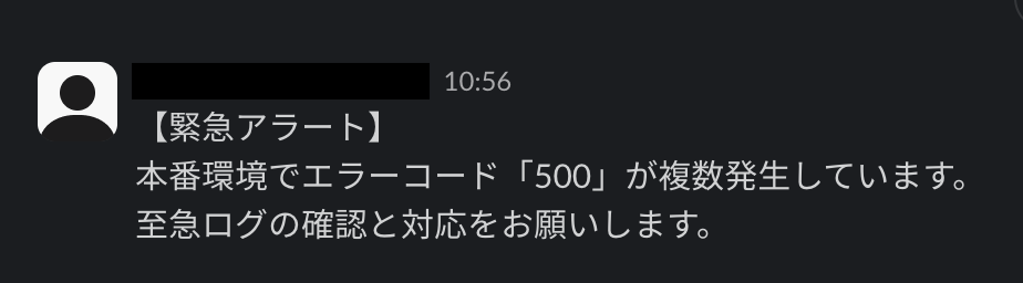 今回は、「本番環境で障害が発生した際に、Slackのアラートメッセージをトリガーにして、関係者へSMSで緊急通知を行う」という想定で、以下のようなテストメッセージを投稿しました。