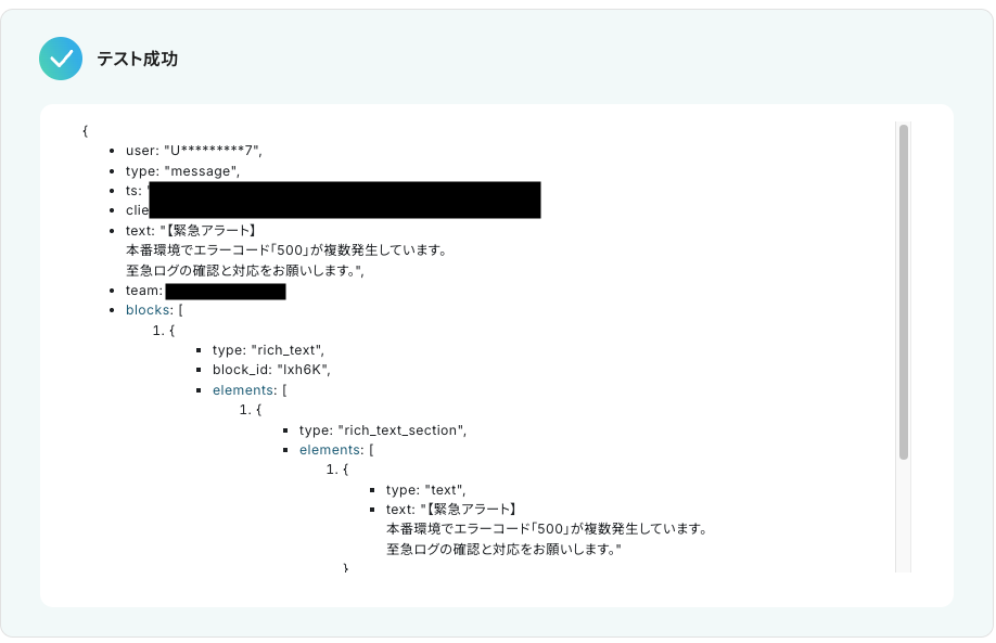テストに成功すると、Slackに投稿されたメッセージの情報が一覧で表示されます。