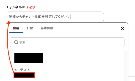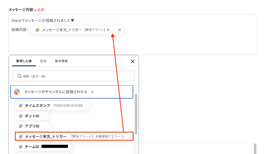 入力欄をクリックすると、前のステップでSlackから取得済みのアウトプットが表示されるので、選択して入力しましょう。
