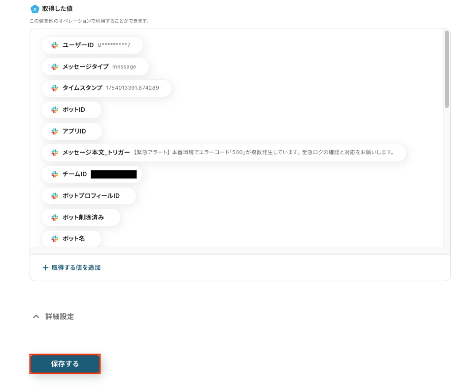 以下の画像の取得した値(=アウトプット)をもとに、Twilioへ登録が可能です。内容を確認し、「保存する」をクリックします。