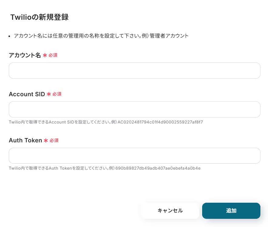 以下の画面が表示されるので、アカウント名、Account SID、Auth Tokenを入力し「追加」をクリックしましょう。