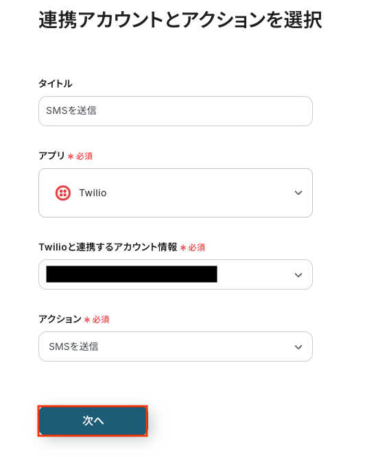 Twilioと連携するアカウント情報に問題がなければ、「次へ」をクリックします。
