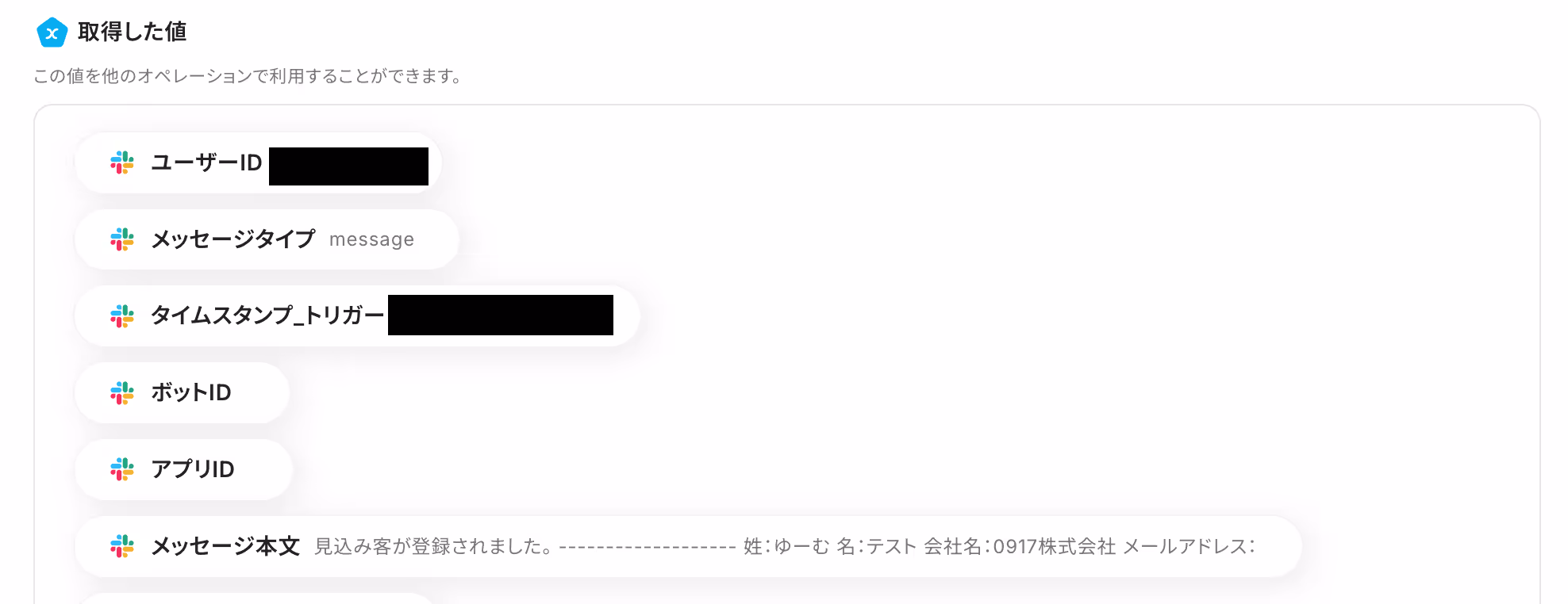 トリガーやオペレーション設定時に、「テスト」を実行して取得した値のことを指します。
