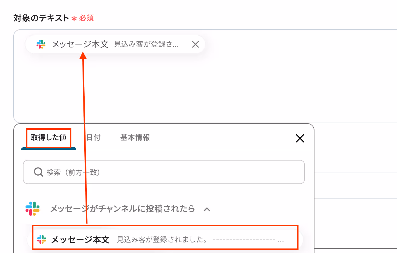 対象のテキストはSlackの取得した値から「メッセージ本文」を選択してください。