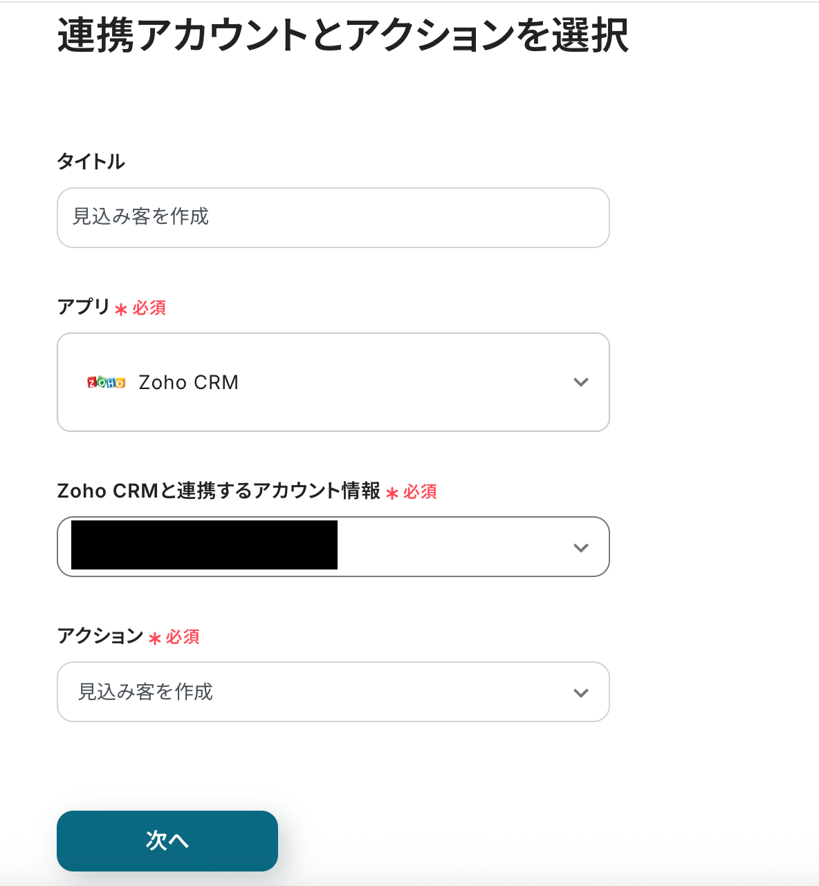 連携アカウントとアクションを選択する画面は、以下を確認して「次へ」をクリックしましょう。