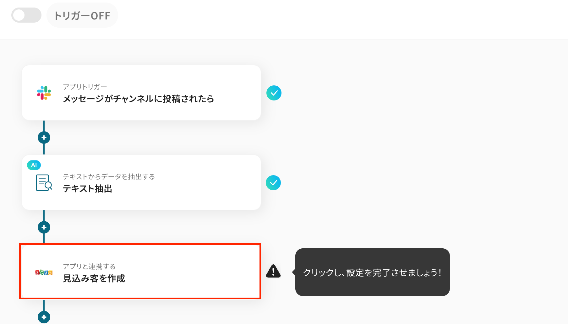 このテンプレートを利用すれば、Slackへの投稿をトリガーに、自動でZoho CRMに見込み顧客を作成することが可能です。