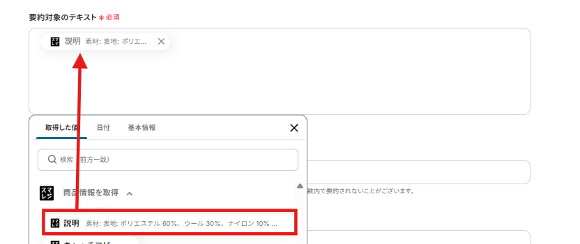 要約対象のテキストには、以下のようにスマレジから取得した値を入力しましょう。