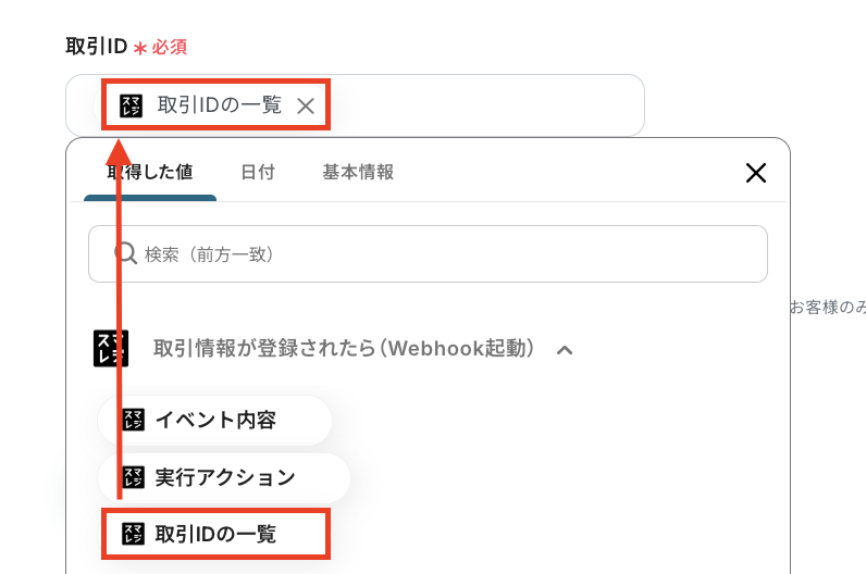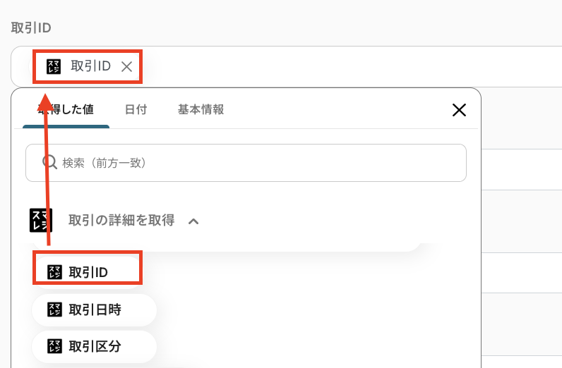 「取得した値」の「取引情報が登録されたら(Webhook起動)」内にある、「取引ID」を選択してくださいね!