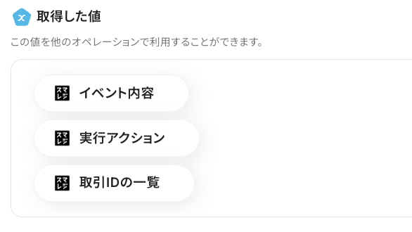 たとえば「取引ID」には、「取得した値」の「取引の詳細を取得」内にある、「取引ID」を選択する、といったように適切な値を選択しましょう。