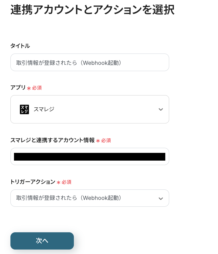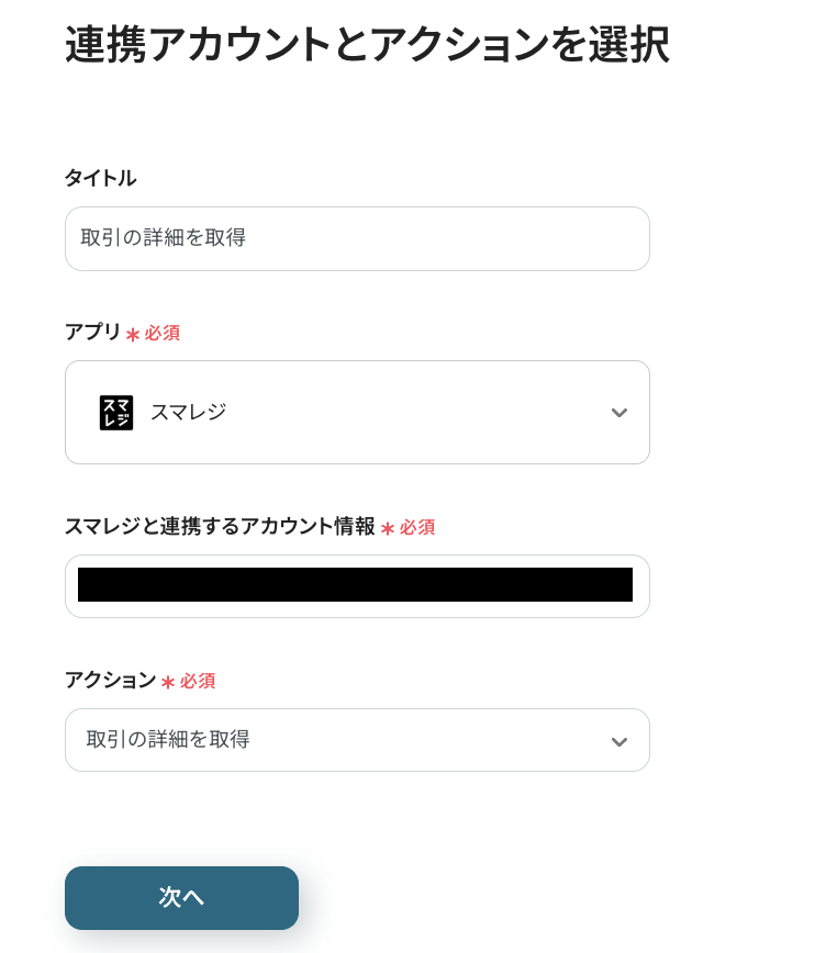 アクションは「取引の詳細を取得」のままにして、「次へ」を押してください。