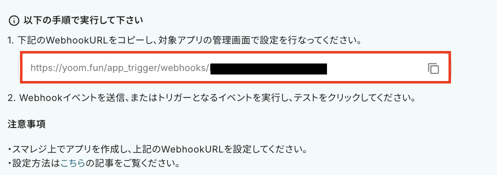 Webhookの設定は、スマレジの管理画面で行います。下図赤枠内のURLをコピーし、こちらのヘルプページを参考に設定を行ってください。