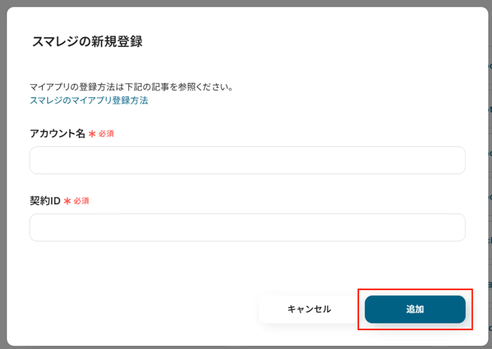 「スマレジの新規登録」画面で、Yoomと連携するスマレジの「アカウント名」と「契約ID」を入力し、「追加」を押したら連携完了です!