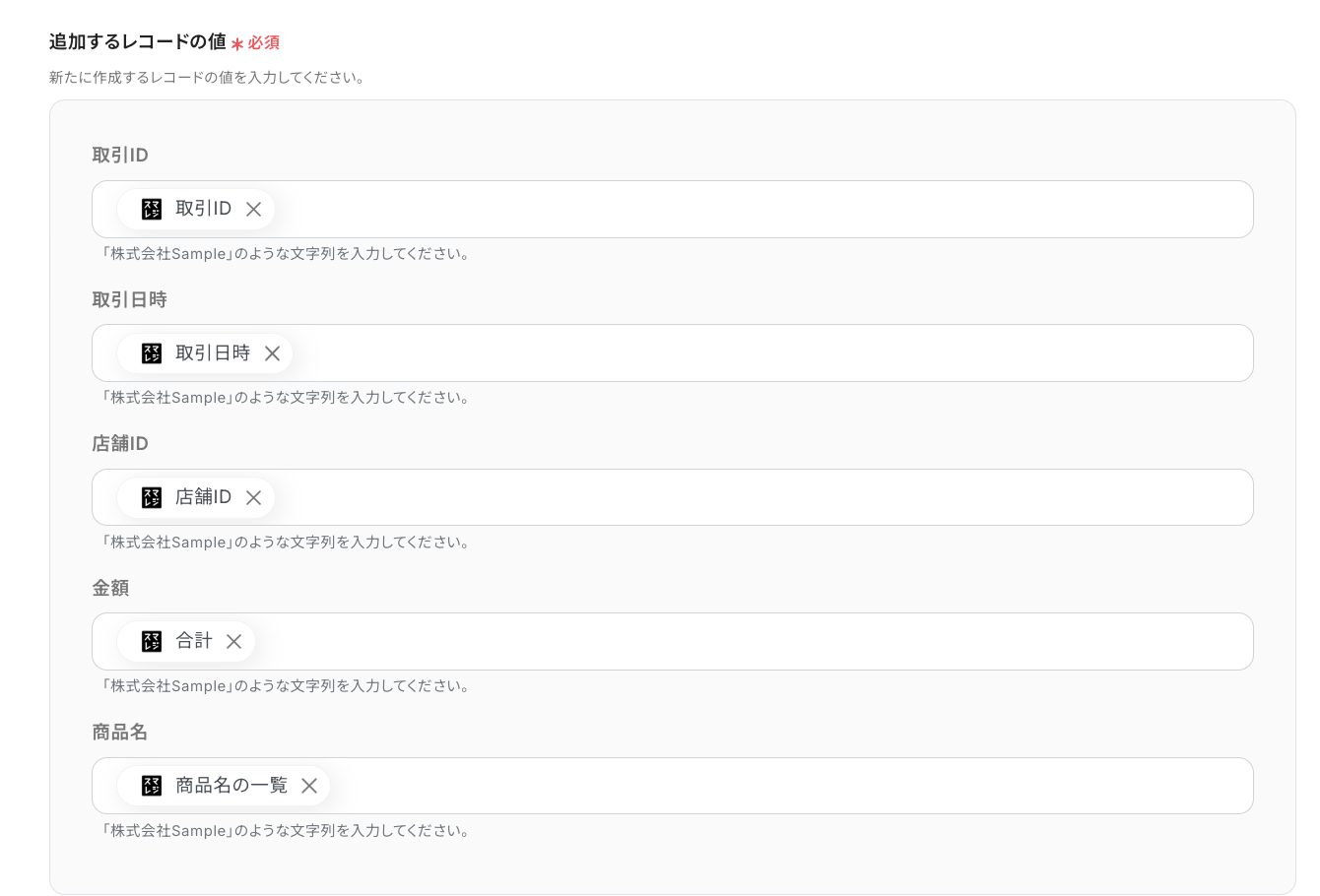 「追加するレコードの値」の各項目を、適切なアウトプットを使って設定していきますよ!